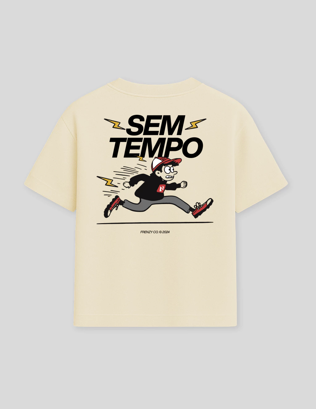 A camiseta Sem Tempo é feita em algodão com modelagem oversized e gola canelada. Conta com etiqueta embutida no decote e estampa em serigrafia de alta durabilidade aplicada na parte frontal.